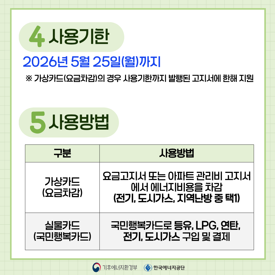 | 실물카드 (국민행복카드) | 연탄, 등유, LPG, 전기, 도시가스 등 현장에서 구매 및 결제 시 사용 가능 |