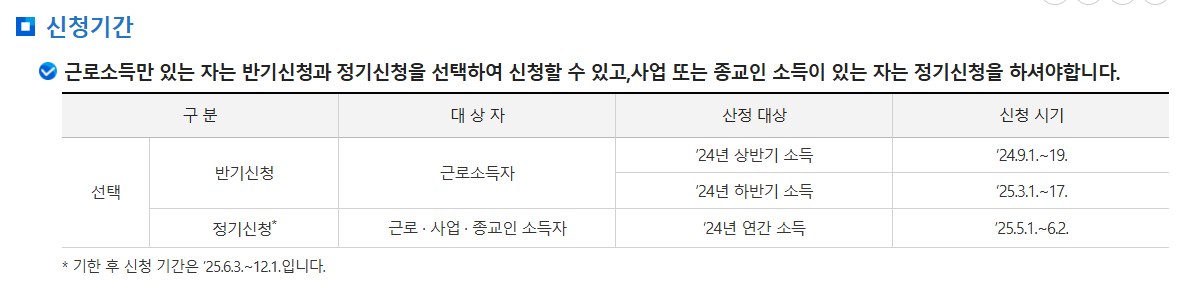 그리고 중요한 점이 하나 더 있어요. 반기 신청은 근로소득자만 가능합니다. 즉, 2024년 하반기에 근로소득이 있어야 한다는 뜻이에요. 만약 사업소득이 있거나 기타소득이 있는 경우에는 반기 신청이 불가능하고, 5월에 진행하는 정기 신청을 이용해야 합니다.